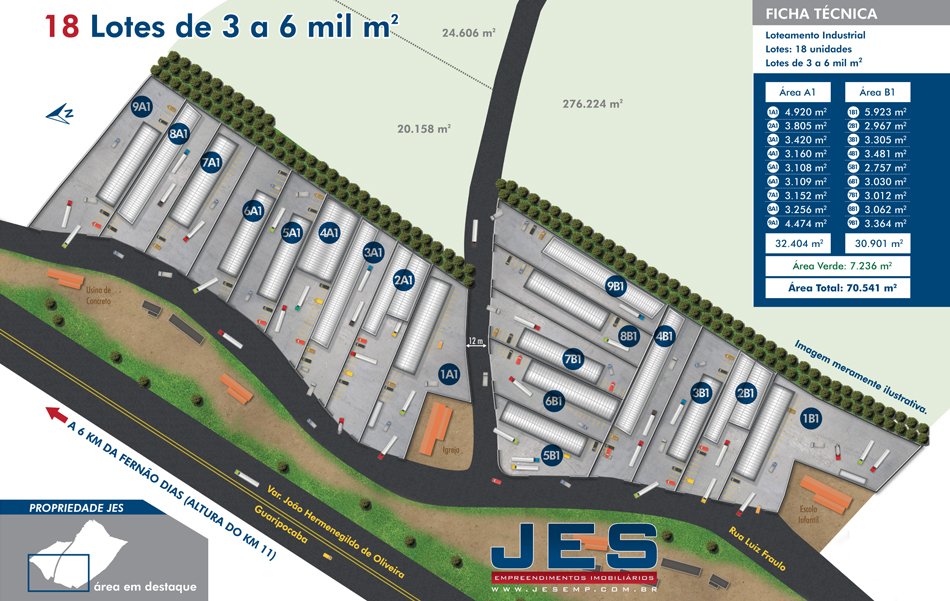 Baixe a imagem acima em alta resolução com os dados do empreendimento e a planta de toda a propriedade JES.